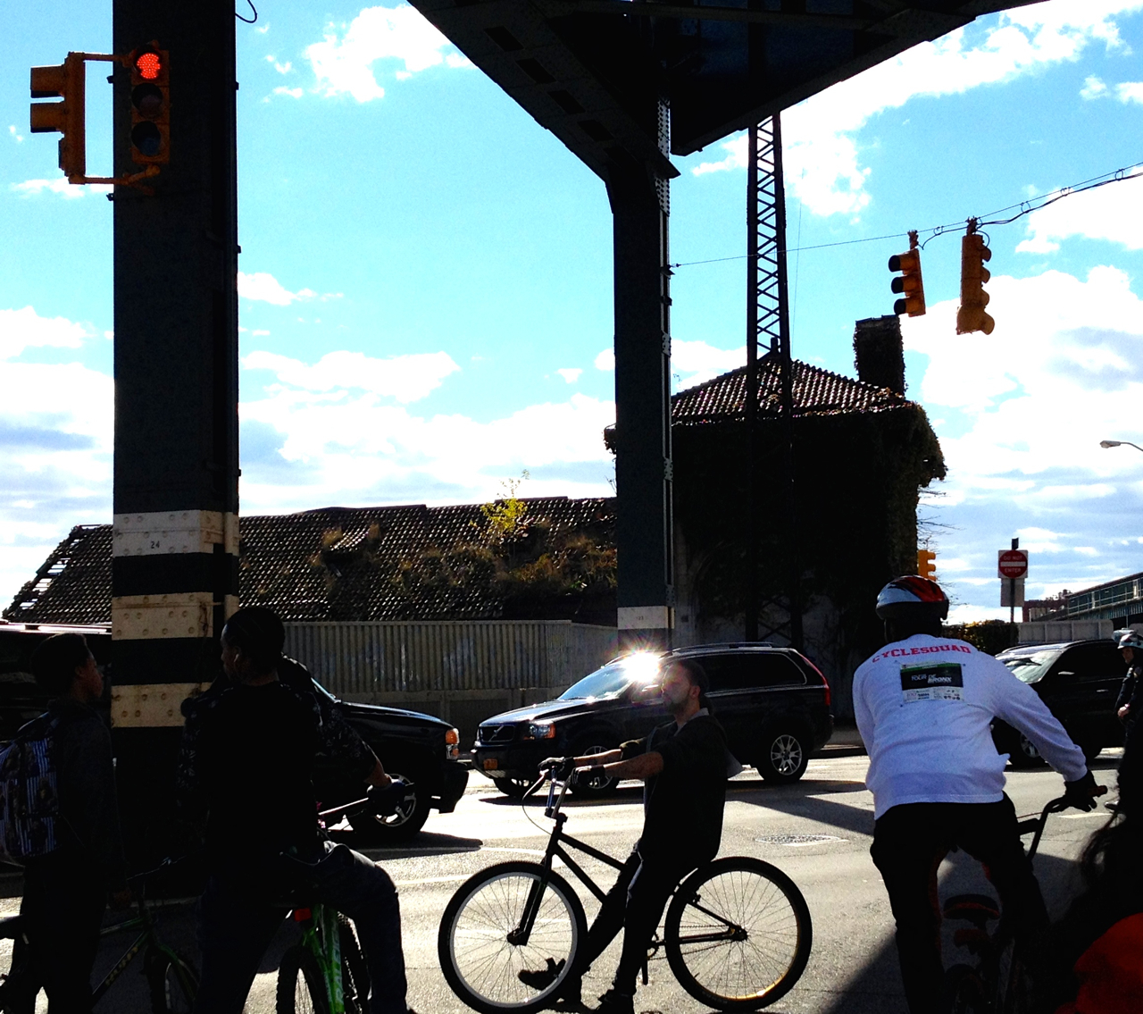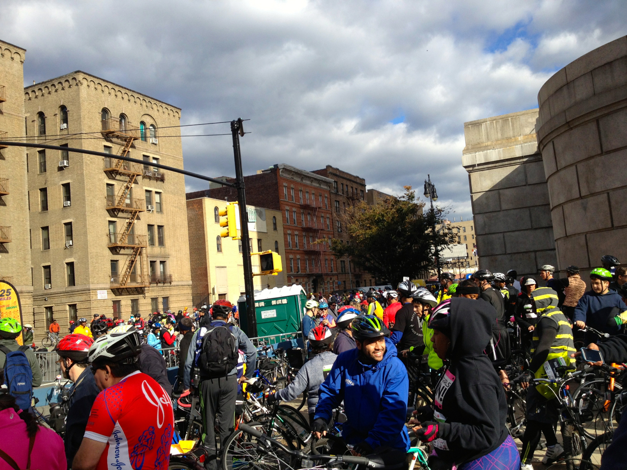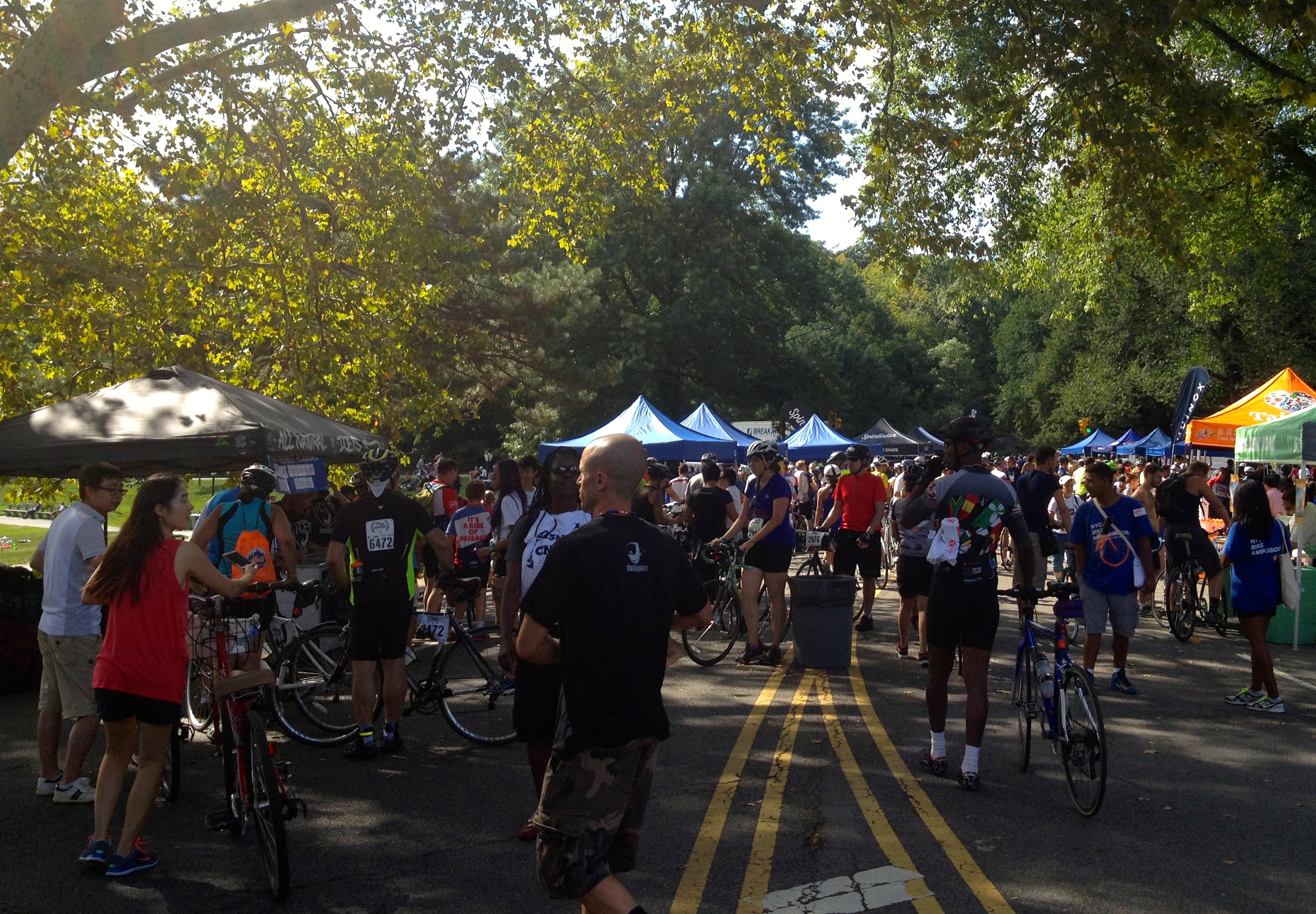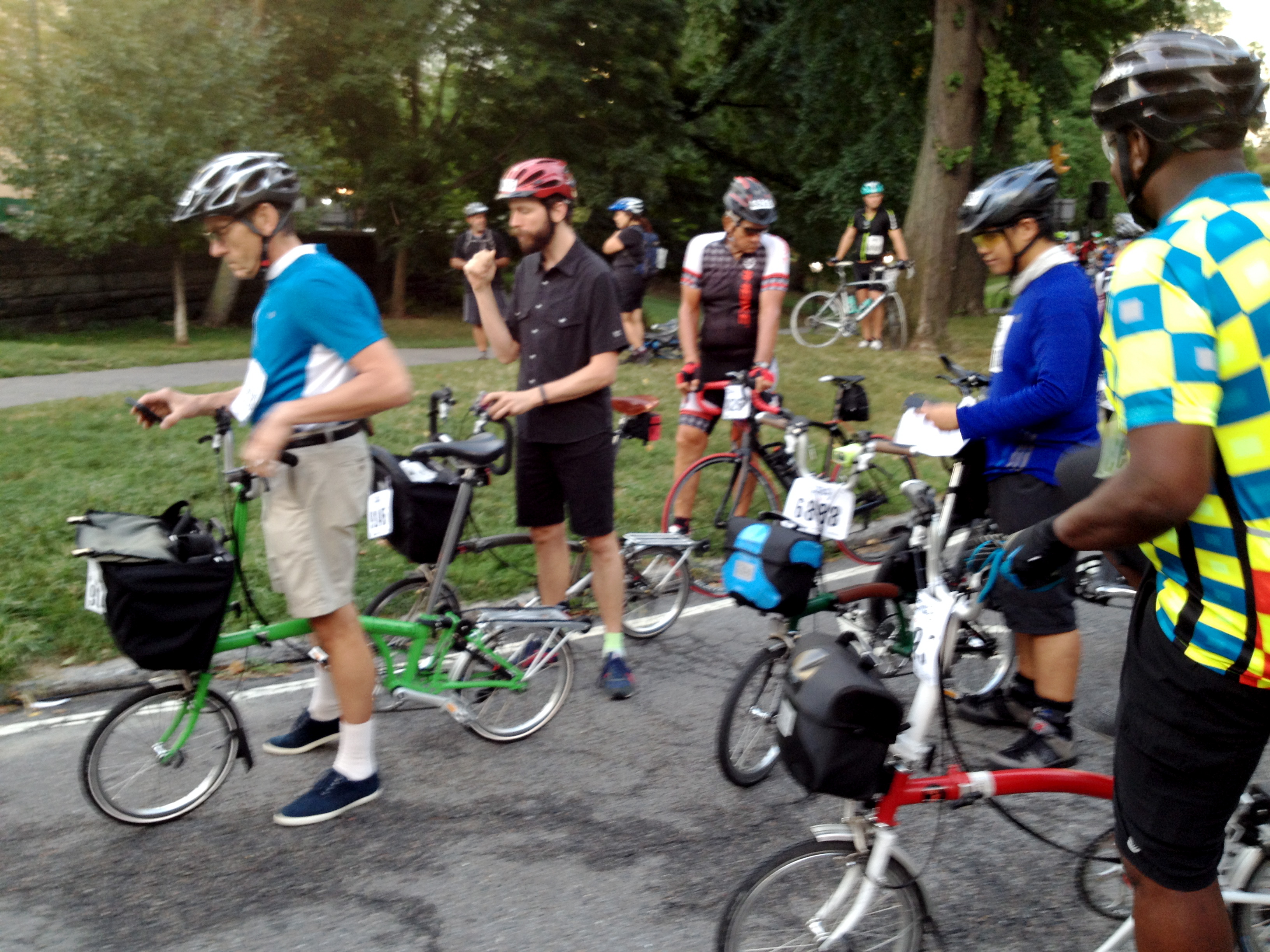 I spotted several Bromptoneers I know from NYCeWheels‘ Saturday rides, including Mr. NYCe himself, shop boss Peter Yuskauskas. He invited me to ride with them, which made the day much more enjoyable and kept me on track. There were cue sheets, and Transportation Alternatives volunteers had painted guiding arrows on the streets, but I am directionally challenged and needed all the help I could get.