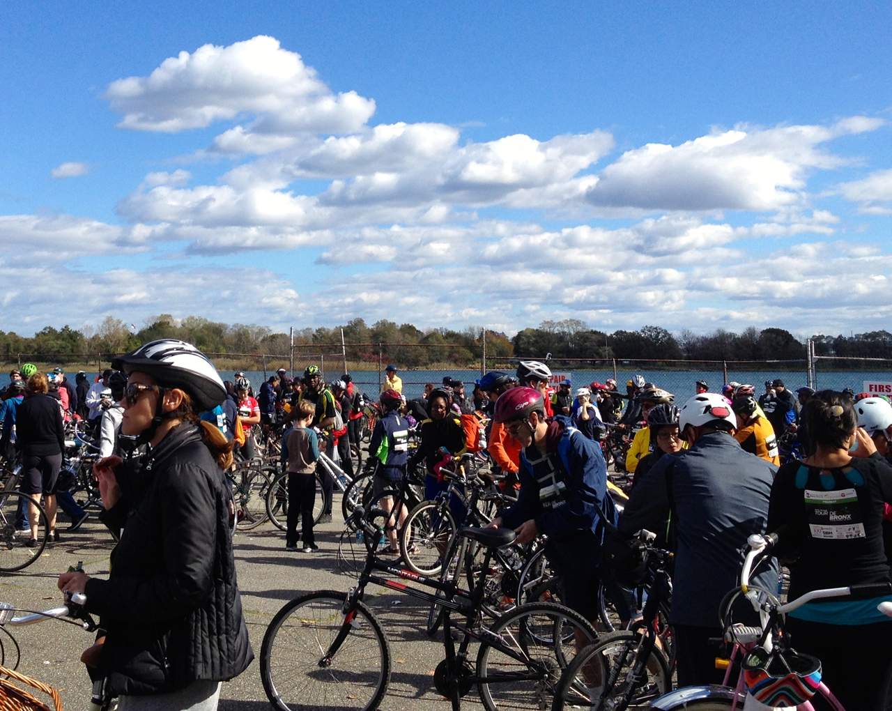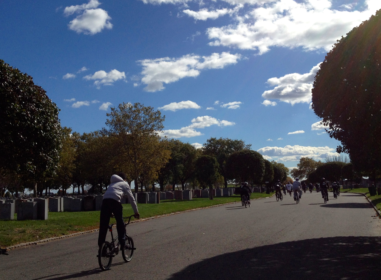 The Pulaski Bridge took us from Brooklyn to Queens, and on to Astoria Park, our last rest stop. Another rider looked Monty over and said it must be exhausting to pedal so far on such tiny wheels. He’d ridden folders, and he knew. Had he tried a Brompton? No. Well, then. Gerry handed him a NYCeWheels card and we encouraged him to stop by the shop for a test ride. Brompton evangelism, friends! It’s a calling.